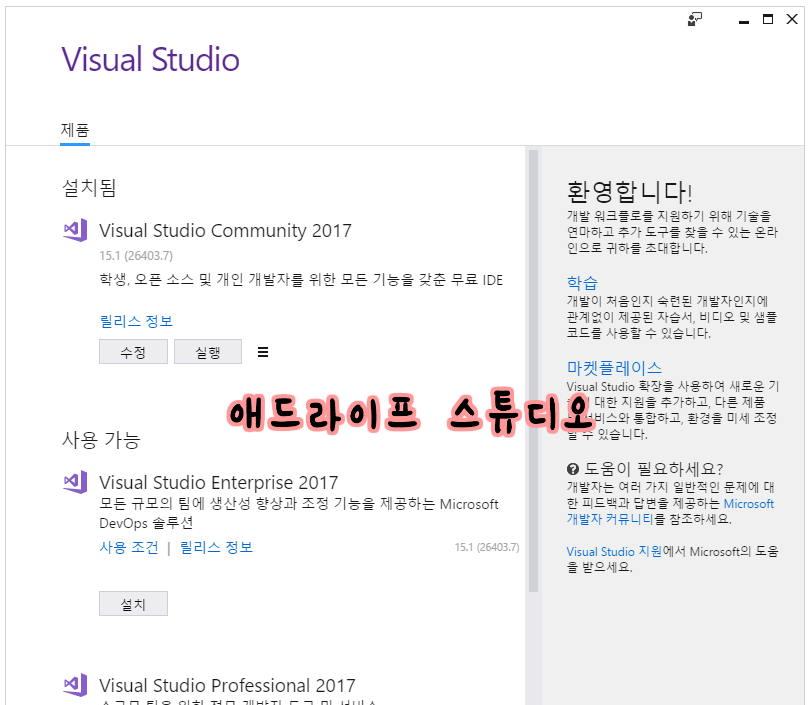 앞으로 진행할 C#은 Visual Studio 2017 Community를 사용할 예정입니다.