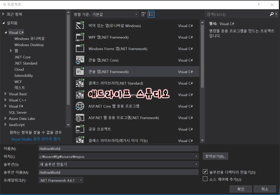 C#기반의 콘솔 프로젝트를 만들기 위해서는 아래 사진과 같이 세팅해 주세요.