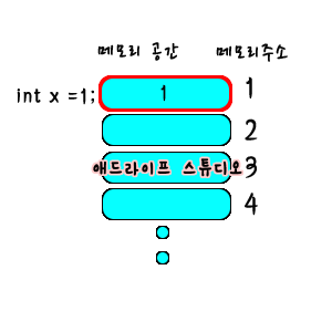 변수 먼저 변수에 대해서 알아보겠습니다. 변수는 어떤한 형식의 값을 대입시켜 변화시킬수 있는 요소를 말합니다. 메모리 영역 측면에서 보면 데이터를 저장하고자 하는 공간을 확보하는 의미죠. 앞서 byte, int, long과 같은 데이터 형식을 언급했는데요. 변수의 구조는 int(데이터 형식) x(변수 이름) =(대입연산자) 1(데이터) ; (문장의 끝)