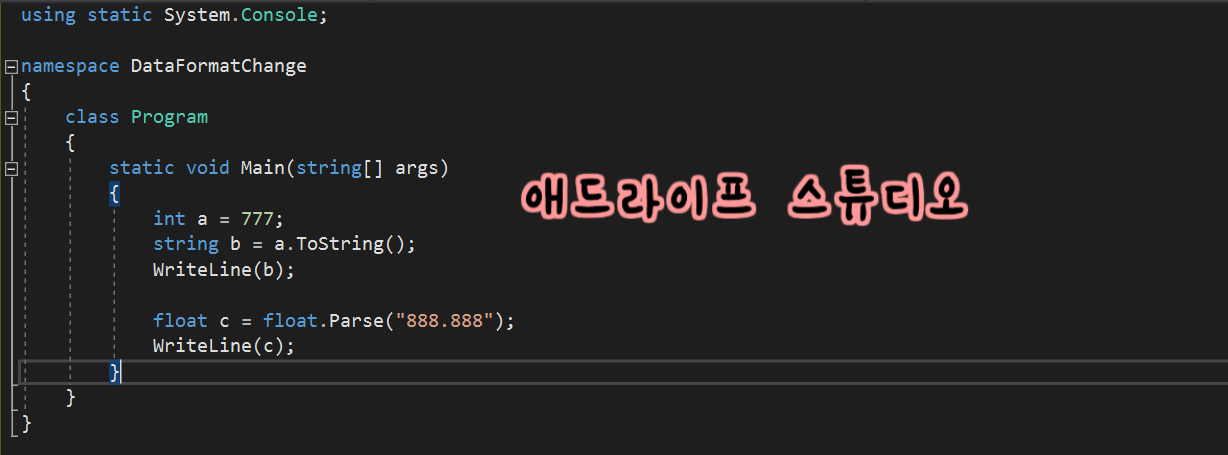 float c = float.Parse("888.888"); 일부러 위에서 정수형을 다뤄서 이번에는 소수형으로 변환하였습니다. 두개 적절히? 잘 섞으면 완성!!! |