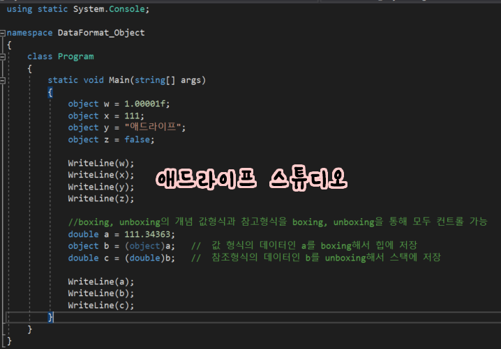 안녕하세요. 애드라이프 입니다. 이전 포스팅에서는 소수 데이터 형식을 알아보았습니다. 소수 데이터 형식 <- 링크 C# 프로그램 시작하기 - 데이터 형식 익히기 #3-1 안녕하세요. 애드라이프 입니다. 이번에도..