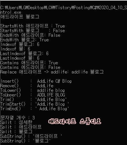 WriteLine("EndsWith 애드라이프: {0}", tistory.EndsWith("애드라이프"));