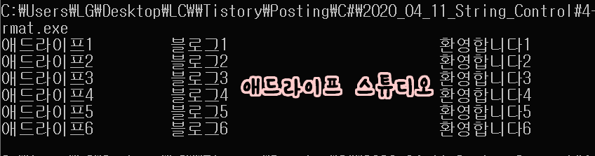 WriteLine(preformat, "애드라이프6", "블로그6", "환영합니다6");