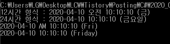 WriteLine("12시간 형식 : {0:yyyy-MM-dd tt hh:mm:ss (ddd)}", datetime);